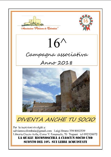 La quota sociale annuale ammonta a 10 euro l’anno. Per il versamento contattare Luigi Bruno cell. 339/8002539 e-mail salviamocolombaia@gmail.com oppure effettuare il versamento presso la Libreria di Ciccio Avila in Corso V. Emanuele Trapani 70 TEL. 0923 20072 LA QUALE RICONOSCERA’ A CIASCUN SOCIO DELL’ASSOCIAZIONE, PER L’ANNO SOCIALE 2018, UNO SCONTO DEL 10% SUI LIBRI ACQUISTATI.