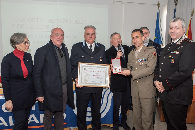 Visibilmente emozionato, è apparso il Commissario Capo della Polizia Penitenziaria, Giuseppe Romano, Comandante di Reparto della C.C. Trapani, alla consegna del Discobolo d’Oro dalle mani del presidente del comitato provinciale trapanese del Centro Sportivo Italiano Rosario Muro. Il premio è stato consegnato durante il convegno: LO SPORT AL SERVIZIO DELL’UOMO E DELLE COMUNITA’ svoltosi il 9 febbraio l’Istituto Industriale Leonardo da Vinci di Trapani. Un premio di indubbio prestigio, dal momento che il Discobolo d’Oro rappresenta uno dei più alti attestati di stima per tutti coloro che nel corso degli anni hanno generosamente dedicato un’ampia parte della loro vita al CSI ed ai suoi ideali, favorendone lo sviluppo e promuovendo la sua proposta sportivo-educativa. Il Presidente Provinciale Rosario Muro nell’esporre le motivazioni del premio ha detto: “Il Comandante Romano è una persona che si è distinta nell’ambito del sociale (…) Il discobolo d’oro è un premio nazionale che viene assegnato solo ed esclusivamente ai dei dirigenti che hanno almeno 30 anni di permanenza nell’ambito del C.S.I., ma quando io ho proposto il suo nominativo e le motivazioni a sostegno, vi debbo dire, che è stato accolto con entusiasmo dal nostro Nazionale”. Ed è stato proprio il Commissario Romano a spiegare nei dettagli, ad una platea attenta di studenti e Autorità, le motivazioni della scelta del CSI provinciale; oltre ad essere stato per un decennio arbitro di calcio del CSI, da anni lo stesso, grazie anche alla perfetta sintonia con il direttore dell’Istituto dr. Renato Persico è l’animatore di tutte le manifestazioni sportive in favore dei detenuti all’interno dell’Istituto trapanese; dalla creazione del Torneo di calcio a 5 A.L.I. (Amicizia, Legalità, Integrazione) giunto alla 4^ edizione la cui caratteristica è che i detenuti giocano in squadre intestate a vittime della Mafia, alle gare di atletica leggera, dalla ristrutturazione di un campo sportivo, alla creazione di campi di bocce e di pallavolo, dalla creazione di ben 5 palestre all’arredamento delle stesse grazie a sponsor e donazioni varie, fino ad arrivare alla iscrizione di una squadra di calcio a 5 formata da detenuti al Campionato “esterno” OPEN del CSI, i “San Giuliano’s Boys” dove le squadre iscritte vengono a giocare, la domenica, all’interno dell’Istituto trapanese. Piccola curiosità: il Commissario Capo Giuseppe Romano è il primo funzionario d’Italia della P.P. a venire insignito di tale riconoscimento