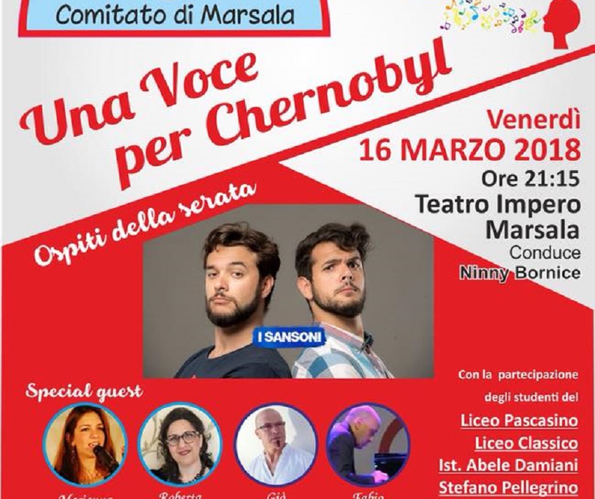 Saranno i comici palermitani I Sansoni gli ospiti speciali della serata "Una voce per Chernobyl", venerdì 16 marzo al Teatro Impero. Popolarissimi sul web- i loro video- sketch hanno milioni di visualizzazioni- sono stati definiti "i filosofi della risata" per la loro comicità- ironia che fa anche riflettere. Non di meno bravura, gli altri special guests della serata: i cantanti Roberta Caly, Fabio Gandolfo, Marianna Montalto, Giò Ingrassia, e i ballerini della Rose Ballet Academy. Gli artisti si esibiranno alternandosi ai giovanissimi cantanti partecipanti al concorso "Una voce per Chernobyl", concorso cui hanno aderito, "prestando" i loro talenti, cinque scuole di Marsala: il Liceo Pascasino, il Liceo Classico "Giovanni XXIII", l´Istituto Agrario "Abele Damiani" e le scuole medie "Stefano Pellegrino" e "G. Mazzini".