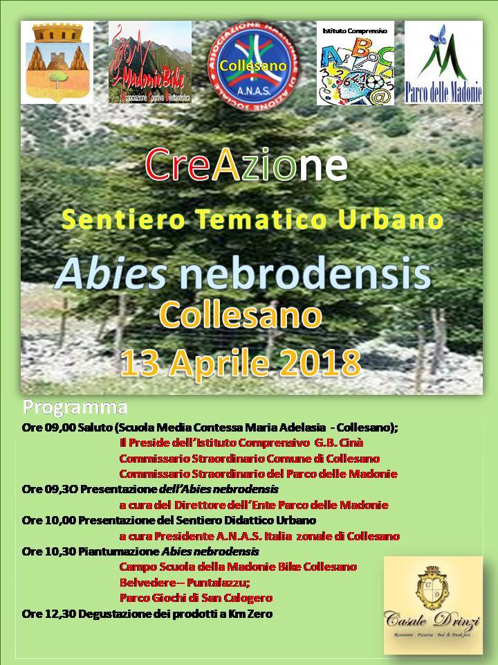 Successivamente verranno collocati le piantine di Abies nebrodensis rispettivamente presso l’atrio della Scuola Media e della scuola della Madonie Bike, Villetta San Calogero, Belvedere Puntalazzu e al Casale Drinzi dove è presente un abies Nebrodensis di circa 30 anni di vita. Questa iniziativa è stato voluta fortemente dell’A.N.A.S. Collesano, che nel territorio madonita da diversi anni promuove e sensibilizza le bellezze naturalistiche ambientale ecc del Parco delle Madonie.