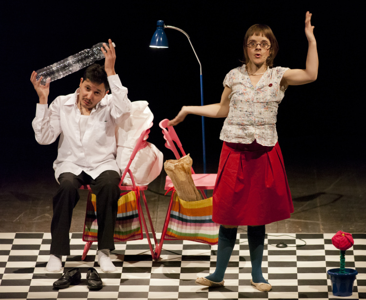 Due piccoli esseri umani, un uomo e una donna dalle fattezze ridotte, si ritrovano sul grande palco dell’esistenza, nascosti nel loro mistero di vita che li riduce dentro uno spazio sempre più stretto dall’arredamento essenziale, stranamente deforme, alla stregua dell’immaginario dei bimbi in fase febbricitante. Attraversano le sezioni della loro tenera per quanto altrettanto terribile, goffa e grottesca vita/giornata condivisa. Sembrano essere chiusi dentro una scatoletta di metallo, asettica e sorda alle bellezze di cui sono potenziali portatori, ma un “balzo” - nonostante le gambe molli- aprirà la custodia del loro carillon. Fuoriescono, vivendo il sogno della vera vita da cui non v’è più bisogno di sfuggire ma solo vivere, con la grazia e l’incanto di chi ha imparato ad amare la fame e la malattia, dunque i limiti dello stare.