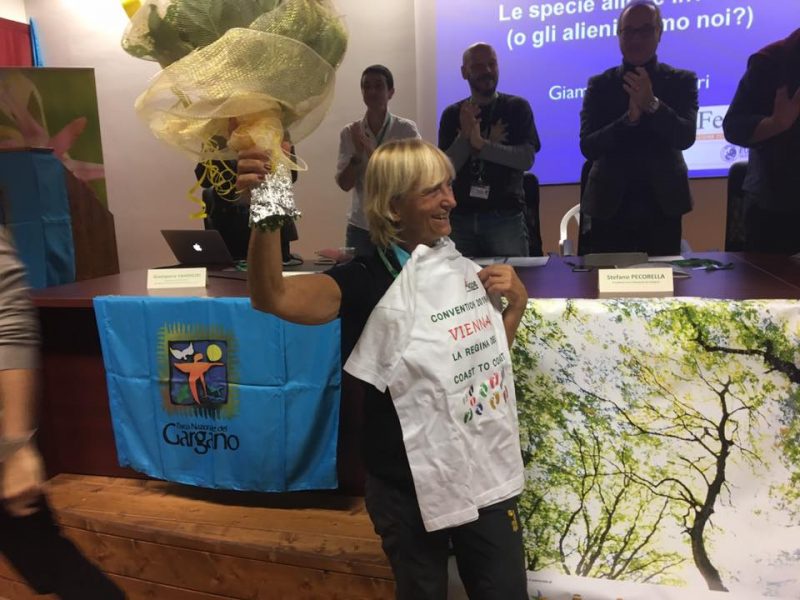 Wolfgang Goethe, il 3 Settembre del 1786 partì dalla cittadina termale di Karlovy Vary, nell’attuale Repubblica Ceca ed il 10 Settembre, a bordo di una carrozza, raggiunse l’Italia. Il sogno del grande scrittore tedesco che arrivò a Palermo il 2 Aprile del 1787, era quello di descrivere l’Italia, culla anche della Civiltà Antica. Ben 30 anni dopo avrebbe poi pubblicato il “ Viaggio in Italia”, un testo ampio che contribuì alla conoscenza del Bel Paese nel mondo. Nacque così il Gran Tour. Il 28 di Agosto del 2017, Vienna Cammarota è partita alle 6 del mattino dalla stessa cittadina, Karlovy Vary. La Guida Ambientale AIGAE italiana ha attraversato totalmente a piedi la Boemia, la Baviera, dunque la Germania, l’Austria, facendo ingresso in Italia a fine Settembre. In Germania le hanno dedicato ampio spazio tutti i giornali. La DPA, agenzia di stampa nazionale tedesca ha realizzato anche un ampio servizio fotografico, ugualmente le testate austriache come l’Agenzia nazionale APA. Grande l’attenzione dei media italiani. Vienna è stata ospitata in importanti trasmissioni nazionali della Rai e non solo. Di lei hanno parlato i telegiornali nazionali. Vienna ha attraversato il Tirolo, il Trentino, il Veneto, l’Emilia – Romagna, la Toscana, l’Umbria, l’Abruzzo, l’Italia Centrale colpita dal sisma, il Lazio, la Campania. Più di 2000 chilometri a piedi, emozionando gli italiani, passando e fermandosi anche nei piccoli borghi del Paese, per parlare con la gente, narrare e descrivere i paesaggi e visitare gli stessi luoghi di Goethe. La gente spesso l’ha riconosciuta ed accolta con amore.