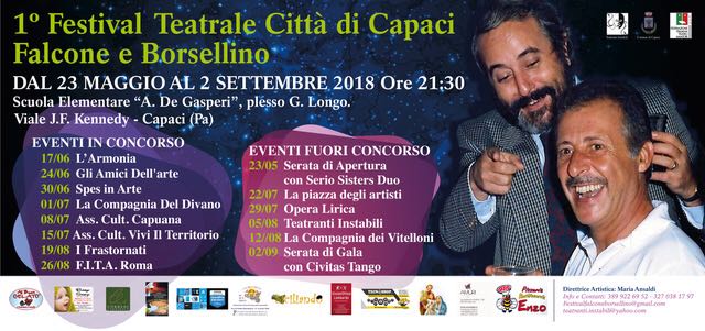 E´ già partito il conto alla rovescia per il primo festival del teatro amatoriale Falcone e Borsellino organizzato dai Teatranti Instabili a Capaci. Si tratta di una manifestazione fatta da chi è nato e cresciuto a Capaci e vuole dare nuovo impulso al territorio, proprio nel giorno in cui si ricorda un eroe: Giovanni Falcone. Otto compagnie teatrali in concorso e quattro spettacoli fuori concorso sul palco allestito nell´atrio interno della scuola elementare Alcide De Gasperi dd Gaetano Longo (via J.F. Kennedy). Si parte il 23 maggio con la serata di apertura. Alle 21 il taglio del nastro, segue un intervento musicale del mezzosoprano Lorena Scarlata Rizzo che canterà “Colapisci” accompagnata da Francesco Davì alla chitarra. “Abbiamo scelto di aprire in questo modo il nostro festival – dice Maria Ansaldi, direttrice artistica della manifestazione che insieme al direttore tecnico Francesco Davì lavora giorno e notte per donare a Capaci il suo festival - perché Colapesce è un eroe siciliano e questa vuole essere una festa dedicata a due eroi che hanno investito la loro vita a combattere la mafia per un futuro migliore. Il nostro vuole essere un contributo, una memoria attiva affinché il loro sacrificio non resti fine a se stesso. Il festival è finanziato esclusivamente da commercianti del territorio e non, singoli cittadini e dai bambini della scuola elementare che ci ospita”. Presenta la serata la giornalista Giada Lo Porto. Ospiti della prima serata Dario Greco, presidente Aiga (associazione italiana giovani avvocati), il procuratore Alfredo Morvillo, il professore Pippo Romeres, il consigliere comunale Giulio Cusumano, Rocco Battaglia, presidente associazione Terra Vecchia che si occupa di recuperare e tramandare la storia di Capaci e Vincenzo Perricone, presidente dell´associazione Siciliano. Presenti il sindaco di Capaci Sebastiano Napoli, il comandante della caserma dei carabinieri di Capaci Paolo Antonio Conigliaro e il vice comandante Antonio La Rocca. La prima serata prosegue con un dialogo con gli ospiti presenti dal titolo "La bellezza salverà il mondo". Poi a intrattenere il pubblico lo spettacolo “Incontri” di Gino Bonanno, i bambini della scuola elementare che diventano poeti per una sera. Chiude la serata il duetto scoppiettante delle Serio Sister. Ogni serata a partire dalle 21 si esibirà una compagnia diversa. Tra quelle in concorso L´Armonia (17 giugno), Gli amici dell´arte (24 giugno), Spes In Arte (30 giugno), La compagnia del divano (1 luglio), Associazione Culturale Capuana (8 luglio), Associazione Vivi il territorio (15 luglio), I Frastornati (19 agosto), F.I.T.A. Roma (26 agosto). Fuori concorso: La piazza degli artisti con la partecipazione di Fabrizio Romagnoli (22 luglio), A spasso con l´opera con Rosolino Claudio Cardile (tenore), Natasa Kàtai (soprano) e Lorena Scarlata Rizzo (mezzosoprano) (29 luglio), I Teatranti Instabili (5 agosto) e La Compagnia dei Vitelloni (12 agosto). Il festival termina il 2 settembre con la serata di gala. Domina la passione del tango argentino con Silvina Larrea e Pablo Pouchot che danzeranno sul palco scaldando gli animi. Seguono le premiazioni. A scegliere i vincitori una giuria di settore più uno spettatore sorteggiato ogni sera. La serata d´apertura è gratuita. Il costo di ogni singolo evento è 3,50 euro, previsto un abbonamento per l´intero festival al costo di 30 euro. Per informazioni, biglietti e abbonamenti scrivere alla mail festivalfalconeborsellino@gmail.com oppure contattare al numero 3284455075.