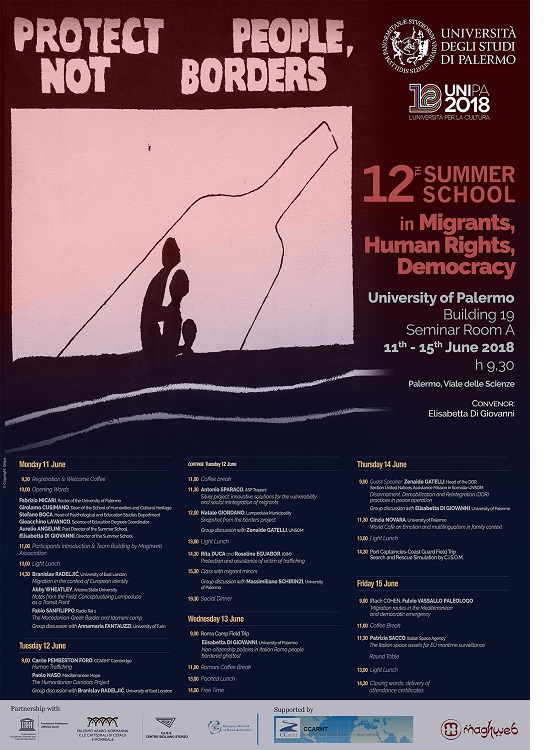 La simulazione, coordinata dal CISOM (Corpo Italiano di Soccorso dell´Ordine di Malta), insieme alla Guardia Costiera e alla Capitaneria di Porto di Palermo fa parte del programma della 12° edizione della Summer School “Migrants, Human Rights, Democracy”, promossa dal Dipartimento Scienze psicologiche, pedagogiche e della formazione (Università di Palermo). Realizzata in collaborazione con il Cambridge Centre for Applied Research in Human Trafficking, la Summer School prevede la partecipazione di 45 corsisti provenienti da Europa e USA, Afghanistan, Libano, Somalia, Argentina, Palestina, Nigeria, Norvegia, Sud Corea, nonché di una delegazione ganese. I temi e le attività laboratoriali vertono tutti sul focus delle migrazioni forzate e delle varie forme di violazione dei diritti umani.