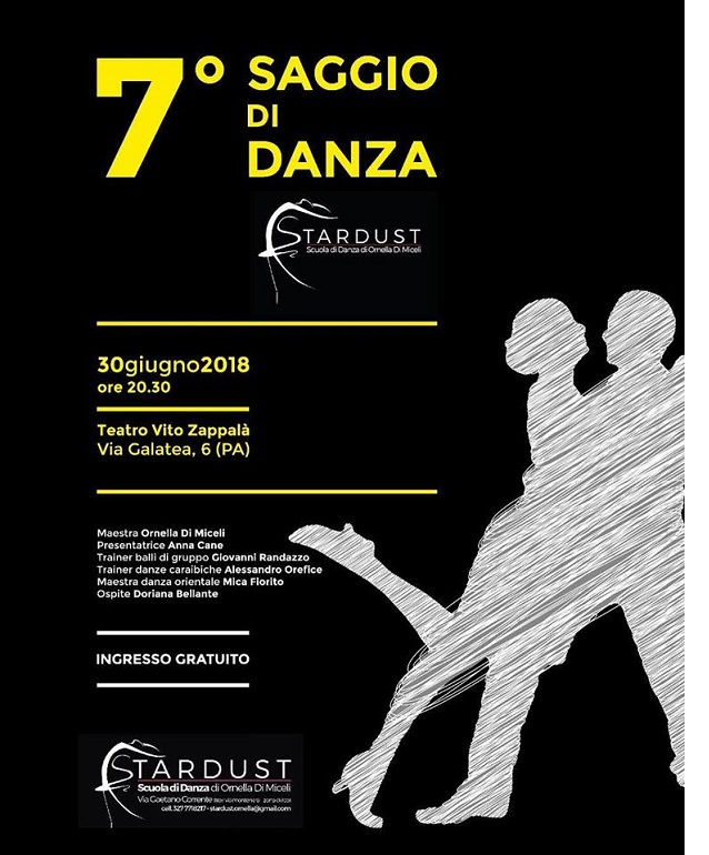 Protagonista la danza in ogni sua forma ed in ogni sua espressione. Sabato 30 giugno a partire dalle ore 20:30 presso il teatro Vito Zappalà (in via Galatea, 6) si terrà il 7° saggio della scuola di danza “Stardust” di Ornella Di Miceli. Sul prestigioso palcoscenico teatrale gli allievi della scuola di danza si esibiranno in diverse coreografie e daranno prova del loro talento, della preparazione tecnica e dei risultati raggiunti. Sarà l’epilogo di un anno di lavoro, di impegni e sforzi per docenti e allievi ma anche un momento di crescita e motivo di orgoglio per tutti. La serata, che sarà presentata dalla giornalista Anna Cane, avrà la direzione artistica della maestra Ornella Di Miceli con la collaborazione di Giovanni Randazzo trainer di balli di gruppo, Alessandro Orefice trainer di danze caraibiche, Mica Fiorito maestra di danze orientali. Ospite della serata la cantante Doriana Bellante. La ricercatezza dei costumi, la creatività nei balletti, la capacità interpretativa degli allievi faranno della serata un evento unico ed imperdibile.