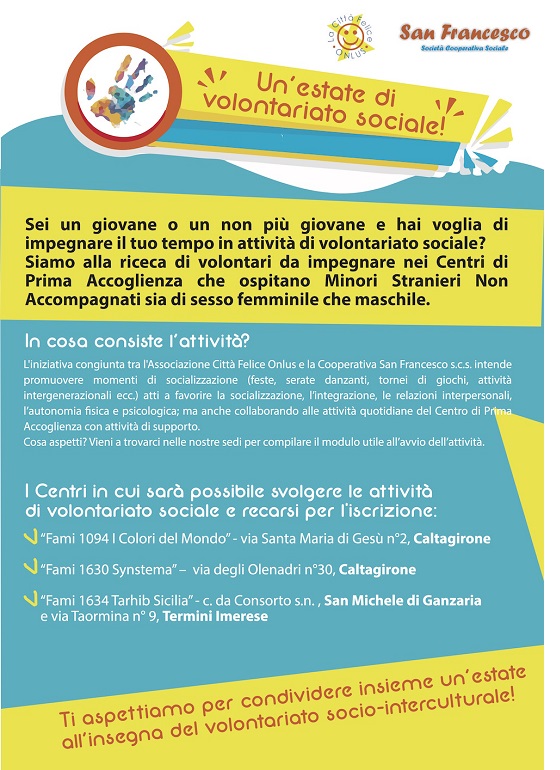 L´Associazione la Città Felice onlus e la Cooperativa San Francesco hanno avviato una iniziativa denominata "Un´estate di volontariato sociale!" con l´intento di reclutare giovani e meno giovani interessati a impiegare il proprio tempo in attività di volontariato.