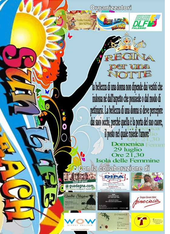 Moda sotto le stelle al lido Sun Life Beach domenica 29 luglio a partire dalle ore 21:00. Una serata di allegria e divertimento che vedrà incoronare la più bella, la “Regina per una notte”. Le ragazze che parteciperanno al concorso, organizzato da Marcello Fenoaltea e Giusy Genzone della Fenfer Eventi con il coordinamento Paola Iuppam, insieme al lido San Life Beach e il Dopolavoro Ferroviario, sfileranno in una passerella allestita per l’occasione sulla spiaggia di Isola delle Femmine, con gli abiti e gli accessori messi a disposizione della boutique “Quattro Stagioni” di corso Finocchiaro Aprile 192/F. In passerella anche gli accessori di Creazioni Jemar di Rita Marsiglia. Le acconciature delle ragazze saranno curate dal gruppo dei Giovani Stilisti di Pino Ciacia, Francesca, Sergio e Anna. Alla vincitrice del concorso saranno omaggiati l’abito e gli accessori con i quali ha sfilato, un trattamento viso e una piega da Hair & Beauty Studio di Vincenza Chiovaro, un week-end offerto dal Lido e dal DLF, un omaggio da Regalandia Village di Viale Regione Siciliana 486, ancora uno da Wow di viale Croce Rossa 77/A e altre sorprese che verranno svelate durante la serata. La “Regina per una notte” parteciperà inoltre alla campagna pubblicitaria natalizia del centro Guadagna di Palermo. A decretare la vincitrice sarà un’attenta giuria che valuterà la bellezza, il portamento e l’eleganza delle candidate. Ad aprire la serata, presentata da Anna Cane, saranno i bambini, da sempre al centro nell’animazione Fenfer. Bambini di tutte le età percorreranno la passerella mettendo in luce la loro allegria e simpatia. Tra loro saranno scelti Miss e Mister Baby Mascotte che saranno premiati con giocattoli offerti da Dipa di Viale Strasburgo. Ad impreziosire la location un esemplare vintage di Moto Guzzi Stornello messa a disposizione da Paolo Chifari e una Vespa 125 anni ‘70  di Tonino Trapani. Durante la serata, sarà possibile, inoltre, acquistare oggetti di artigianato, realizzati a mano. Il ricavato dalla vendita degli oggetti sarà devoluto all’associazione onlus  “Comunità di Israele”. Una serata da non perdere, alla quale siete tutti invitati.