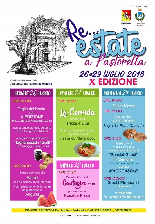 OGGI, Giovedì 26 Luglio - P.zza SS. Filippo e Giacomo (dalle ore 19,30) FESTIVAL DEL TRAMONTO, Villaggio del Gusto, Raggi di Note, Riccardo Sciacca e la sua Band - C.da Pastorella (dalle ore 21) RE...ESTATE A PASTORELLA, apertura della X edizione (proseguirà fino a domenica 29) - Atrio Comunale (ore 21) ALESSANDRO D´AVENIA presenta il suo libro “Ogni storia è una storia d´amore”