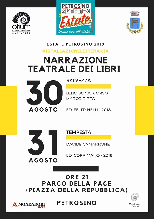 Petrosino, 27.08.2018 Si chiuderà questa settimana “Petrosino Estate 2018”, il ricco e variegato cartellone di manifestazioni promosso dall’amministrazione comunale guidata dal Sindaco Gaspare Giacalone. In calendario un doppio appuntamento culturale organizzato dall’associazione “Otium”, con la narrazione teatrale di due libri al Parco della Pace, in piazza della Repubblica, sul tema della migrazione. A dialogare con il pubblico saranno gli autori dei due volumi.