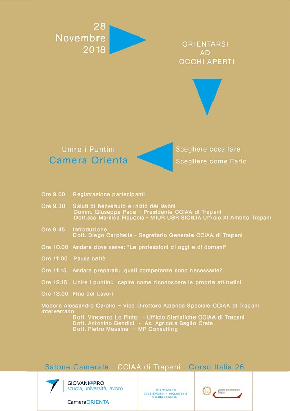 Il 28 novembre 2018 la Camera di commercio di Trapani – in linea con la propria mission sul tema dell’orientamento – in collaborazione con l’Ufficio Scolastico Regionale SICILIA - UFFICIO XI AMBITO DI TRAPANI, organizza l’evento Camera Orienta. Un momento di incontro su orientamento al lavoro e cultura di impresa per consentire ai giovani di conoscere l’evoluzione del lavoro del proprio territorio.