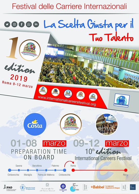 Al via anche quest´anno il Festival delle Carriere Internazionali, il Festival che giunge alla sua 10° Edizione e vedrà Roma al Centro del mondo dal 9 al 12 Marzo 2019, l´evento è rivolto agli Studenti Superiori ed Universitari ed è riconosciuto, tramite apposite convenzioni, dall´Università degli Studi di Messina che valida la partecipazione a tale evento come CFU per attività formative o tirocinio. Fare Per Cambiare è partner per guidare gli studenti Messinesi in questa meravigliosa esperienza.