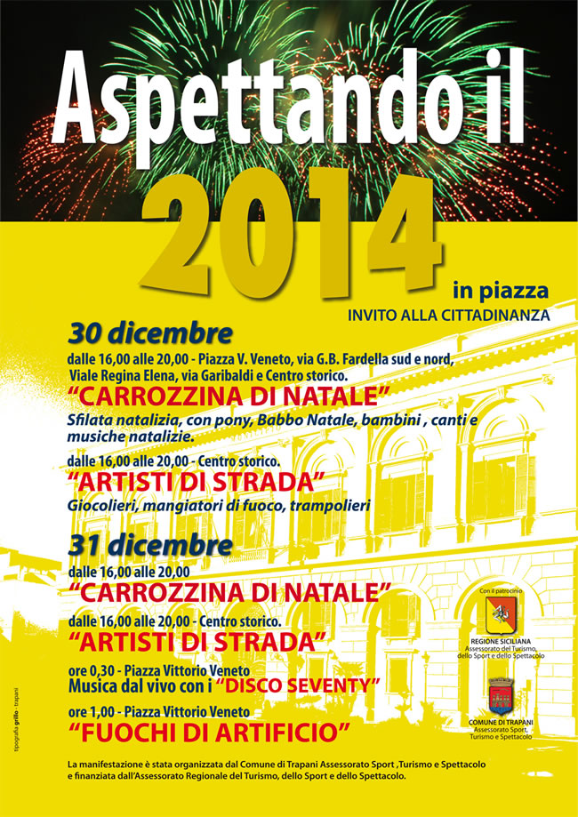 Sfilate a tema natalizio, spettacoli con artisti da strada, musica dal vivo ed i tradizionali "botti". E´ il capodanno organizzato dall´assessorato allo sport, turismo e spettacolo del Comune di Trapani e finanziato dall´omonimo assessorato regionale. Domani, dalle 16 alle 20, ci sarà la sfilata della "Carrozzina di Natale". Il corteo con pony, Babbo Natale e bambini, accompagnato dai tradizionali cori natalizi partirà da Piazza Vittorio Veneto ed attraverserà ambo i lati della via Fardella per poi rientrare nel centro storico. Sempre dalle 16 alle 20, nel centro storico, ci saranno spettacoli con giocolieri, mangiatori di fuoco e trampolieri. Per quanto riguarda la notte di San Silvestro, subito dopo la Mezzanotte è prevista musica dal vivo in piazza Vittorio Veneto con i "Disco Seventy". All´1.00 ci saranno invece i giochi pirotecnici.