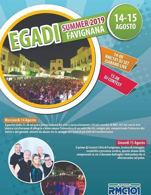 “Egadi Summer”, invece, propone due serate di intrattenimento musicale con DJ set il 14 e 15 agosto a Favignana a partire dalle ore 22.30 in piazza Madrie a cura di Isaband dal vivo e poi con i vocalist di RMC101