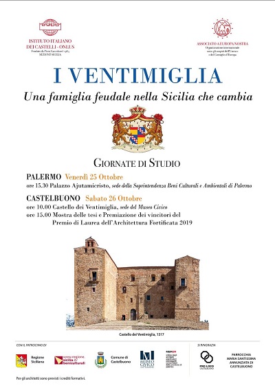 Venerdì 25 ottobre dalle 15.30, il palermitano Palazzo Ajutamicristo - sede della Soprintendenza per i Beni Culturali ed Ambientali - ospita la prima parte di un simposio di studi sulla famiglia Ventimiglia e sul loro contemporaneo impegno per valorizzare il patrimonio castellano a cui partecipano - tra gli altri - il Presidente della Regione Sicilia On. Nello Musumeci, il Sindaco di Palermo On. Leoluca Orlando, il Soprintendente Lina Bellanca e il presidente dell’Istituto Italiano Castelli, Fabio Pignatelli della Leonessa, insieme con la vicepresidente nazionale, la siciliana Michaela Stagno D’Alcontres Marullo ed il presidente della sezione siciliana della Onlus, Francesco Cultrera di Montesano.
