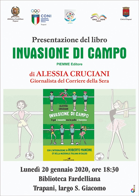 “Abbattere i pregiudizi che pesano ancora su tante ragazze che praticano uno sport è un obiettivo che deve coinvolgere tutte le Istituzioni per promuovere un comune processo culturale, difficile a diffondersi, ma sicuramente necessario”. Sarà questo il filo conduttore dell’incontro con la giornalista Alessia Cruciani che per l’occasione, presso la Biblioteca Fardelliana, lunedì 20 gennaio, alle ore 18.30, presenterà il suo libro dal titolo “Invasione di campo” - Piemme Editore. Un evento promosso dall’Amministrazione Comunale di Trapani, sensibile a questa tematica che si inserisce nell’ambito del Progetto “Trapani è donna”, ed in collaborazione con l’I.C. “Bassi-Catalano” e la Delegazione Provinciale CONI. Un libro di notevole interesse sociale la cui introduzione è stata curata dal C.T. della Nazionale di calcio Roberto Mancini. Un romanzo considerato tra i cinque migliori libri per ragazzi del 2019 che può sicuramente contribuire ad educarli e sensibilizzarli nell’eliminazione degli stereotipi di genere, nel rispetto della persona, non solo su un campo da gioco, ma soprattutto sul campo della vita. Da segnalare la presenza, all’interno del romanzo, di due donne trapanesi, la prof.ssa Elena Avellone, delegata CONI che ha suggerito la tematica all’autrice e la campionessa di calcio del Trapani Girl, poi giocatrice di serie A, Paola Bresciano, eletta nel 1976 Miss Italia. La giornalista Cruciani presenterà il suo libro anche l’indomani, martedì 21 gennaio, alle ore 10.30, agli studenti dell’Istituto Comprensvo “Bassi – Catalano” che avranno modo di dialogare sugli spunti educativi emersi dalal lettura del libro. Diverse copie del libro saranno donate dal Comune di Trapani ai cinque Istituti Comprensivi della Città. In allegato locandina