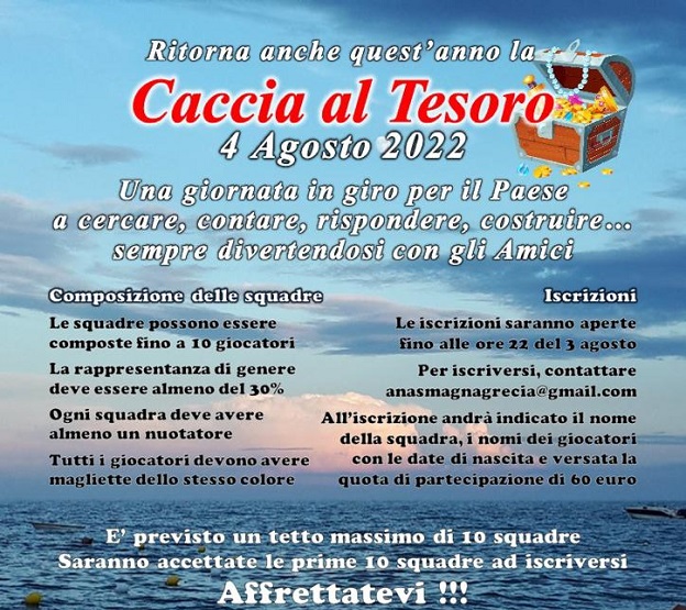 Anche quest´anno la rete ANAS (Associazione Nazionale di Azione Sociale) con le affiliate, organizza la caccia al tesoro, tra le vie del paese. L´evento è strutturato su due momenti, il primo la mattina a partire dalle ore 10.30 ed il secondo di pomeriggio dalle ore 16.00. Luogo di partenza, è sempre lo stesso, lo stabilimento balneare la Canniccia.