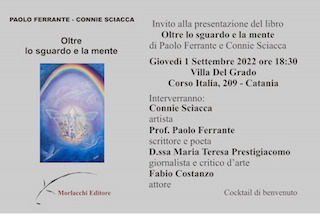 Catania. Villa del Grado, prestigiosa antica splendida dimora, già Villa Cigno- Cocuzza, con il suo Parco, aprono il sipario per la presentazione del libro del poeta agrigentino Paolo Ferrante, illustrato dalla pittrice Connie Sciacca, catanese. L´uno settembre alle ore 18.30, il Parco di Villa del Grado avrà presenze prestigiose di intellettuali; tra i quali il noto critico d´arte e letterario Prof.ssa Maria Teresa Prestigiacomo che presenterà la mostra di Connie Sciacca, inerente al libro e la silloge poetica, Morlacchi Editore, di Paolo Ferrante, decodificandone i messaggi sottesi delle opere che corredano e completano la silloge poetica ed evidenziando la stretta corrispondenza biunivoca tra ciascuna poesia ed il corrispettivo quadro. Sara´ presente il fotografo d´ arte Massimo Pantano ed il Fotografo d´ arte Paolo Barbera. Il titolo del libro, di Ferrante, al suo settimo libro, ci offre subito un primo input, per una chiave di lettura: " Oltre lo sguardo e la mente". Connie Sciacca interpreta le liriche, attraverso le sue opere metafisiche surreali, esoteriche, religiosamente spirituali che ben traducono lo spirito, il messaggio del Poeta. Connie Sciacca, pluripremiata vincitrice in numerosi concorsi indetti dall´Accademia Euromediterranea delle Arti, ha esposto in numerose mostre collettive e Personali, anche sotto l´egida del critico prof.ssa Maria Teresa Prestigiacomo, con successo di critica e di pubblico. Svolgendo, Ferrante, il ruolo di docente di Religione, non potevano non trovarsi, in seno alla silloge, dei "passi", riconducibili alle Scritture Sacre, ebraiche e cristiane. Un appuntamento sicuramente da non perdere per gli interessanti quadri, per i contenuti profondi del testo e per il rilassante Parco della Villa del Grado Villa Cigno Cocuzza dell´Architetto Atanasio; Villa del Grado è un pregiato scrigno Liberty nel cuore della Catania delle griffes Corso Italia, 209, nel centro cittadino, una volta luogo di villeggiatura, a due passi dal mare.