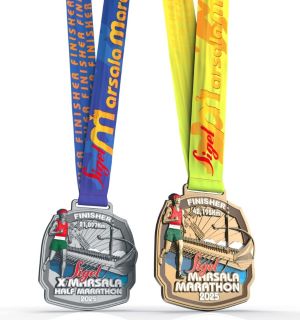 Un fiume di novità, un florilegio di ragioni per essere il 27 aprile a Marsala, per la prima assoluta della Sigel Marsala Marathon-Città Garibaldina. La medaglia che andrà a tutti i finisher è solo l’ultimo motivo d’interesse della prova siciliana, con la sua fusione di natura, storia e cultura. Non è solo un premio per i corridori, ma anche un tributo alla città e al suo patrimonio. Ogni elemento, progettato con cura dal designer Vincenzo Maggio della Design&Progetto di Marsala, evoca infatti in un connubio perfetto, l’anima naturale del territorio, dalle saline al mare, dalla nave punica ad un “originale Garibaldi” in veste di runner; tutto è scelto con cura per rendere omaggio alla ricchezza di Marsala, un luogo dove il passato e il presente si intrecciano e dove ogni corsa rappresenta un passo verso il futuro, trasformando ogni traguardo in un frammento di storia vissuta. Due le versioni, quelle dorata di dimensioni generose per coloro che porteranno a termine la distanza dei 42,195 km ed una argentata, dal diametro un po’ più piccolo, per coloro che “chiuderanno” la distanza dei 21,097 km.