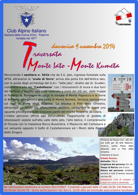 Sarà l´occasione per soffermarsi con il G.A.I. Valle Jato agli scavi del Castellazzo, prima di proseguire verso la vetta di Monte Kumeta e Portella della Ginestra.