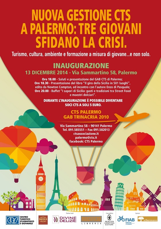 TURISMO, CULTURA, AMBIENTE E FORMAZIONE A MISURA DI GIOVANE… E NON SOLO Inaugurazione sabato 13 dicembre 2014 – ore 18.00 c/o CTS TRINACRIA2010 Via Sammartino, 58 - 90141 Palermo (PA) Palermo, 12 dicembre 2014 – Si chiamano Valentina, Alessandra e Marco, i tre ragazzi siciliani che hanno deciso di puntare sulla loro isola e su CTS -Centro Turistico Studentesco e Giovanile- l’associazione che dal 1974 si occupa del viaggio come momento di scambio culturale e di crescita personale nonché come momento formativo dei giovani. A differenza di molti hanno deciso di restare in Italia e di scommettere sul loro futuro. Per mesi hanno cercato l’idea giusta e alla fine l’hanno trovata nel CTS, una grande community in cui il viaggio rappresenta solo una parte della sua identità. È possibile infatti partecipare attivamente a progetti di ricerca per la salvaguardia della natura perché CTS dal 1992 è stata riconosciuta dal Ministero dell’Ambiente come associazione di protezione ambientale e seguire percorsi formativi per l’inserimento nel mondo del lavoro. Il viaggio di CTS di Palermo parte il prossimo 13 dicembre proprio dalla storia e dalle tradizioni siciliane con la presentazione del libro di Enzo Di Pasquale autore del testo edito da Newton Compton “Il giro della Sicilia in 501 luoghi”. A parlarne sarà proprio l’autore che propone nel suo libro una serie di percorsi tra città, paesini, contrade, e riserve naturali della Sicilia. Per questo il CTS di Palermo, mira a realizzare iniziative di informazione e sensibilizzazione del turismo sostenibile e responsabile, fornendo occasioni per conoscere le diverse culture del mondo e del territorio siciliano grazie anche alla collaborazione attiva con realtà locali per promuovere le tipicità del territorio facendo riscoprire tradizioni, aromi e profumi della cucina siciliana, gli antichi mestieri e visitando paesaggi naturalistici e antichi borghi. Ogni piccolo gesto può contribuire allo sviluppo dei territori locali grazie al lavoro di persone giovani e dinamiche che vogliono continuare a credere e a lasciare le proprie radici in Sicilia. Ed è proprio per questo motivo che durante l’inaugurazione sarà possibile degustare prodotti tipici siciliani dell’Antica Gastronomia di Savoca di Palermo come pane e panelle, arancinette e dolci artigianali che legano la tradizione e l’innovazione dei cioccolatini dal cuore intenso di Nero D’Avola dell’azienda DivineDelizie di Gela (CL) un vero tributo alla tradizione gastronomica siciliana. Diventare soci CTS significa poter usufruire di numerosi vantaggi grazie alle migliaia di convenzioni per lo shopping online e non scrupolosamente individuate a livello sia nazionale che locale. Con CTS è possibile approfondire la conoscenza delle lingue attraverso i programmi Education o i corsi di lingua all’estero e usufruire di servizi turistici dedicati come passaggi aerei, ferroviari e marittimi, autonoleggio, alberghi e residence universitari, convenzioni con Tour Operator. www.ctsassociazione.it