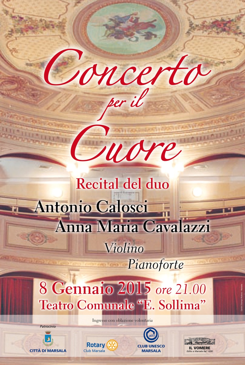 Il Club Unesco Marsala - in collaborazione con il locale Rotary Club e il periodico Il Vomere - organizza una serata di musica classica per domani, giovedì 8 gennaio, al Teatro Comunale (ore 21). Il "Concerto del Cuore", che si avvale del patrocinio del Comune di Marsala, è un recital del Duo Antonio Calosci (Violino) e Anna Maria Cavalazzi (Pianoforte). L’ingresso a 10 euro è, in realtà, un contributo volontario finalizzato all´acquisto di un defibrillatore, in sintonia con l’iniziativa “Marsala Cardioprotetta” - patrocinata anch’essa dal Comune - lanciata dal Rotary Club presieduto da Riccardo Lembo.